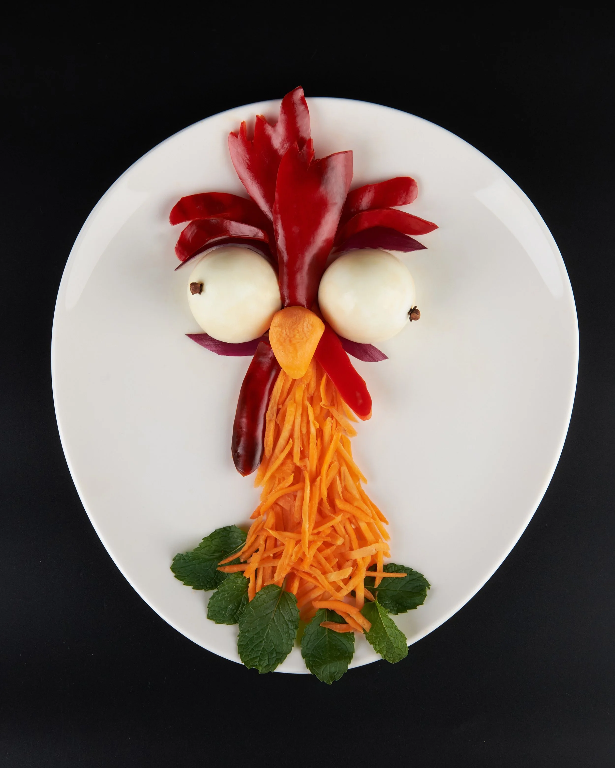 Ingredients: Sweet Italianos, Carrots, Fresh Mint leaves, and hardboiled eggs and whole cloves for the eyes.