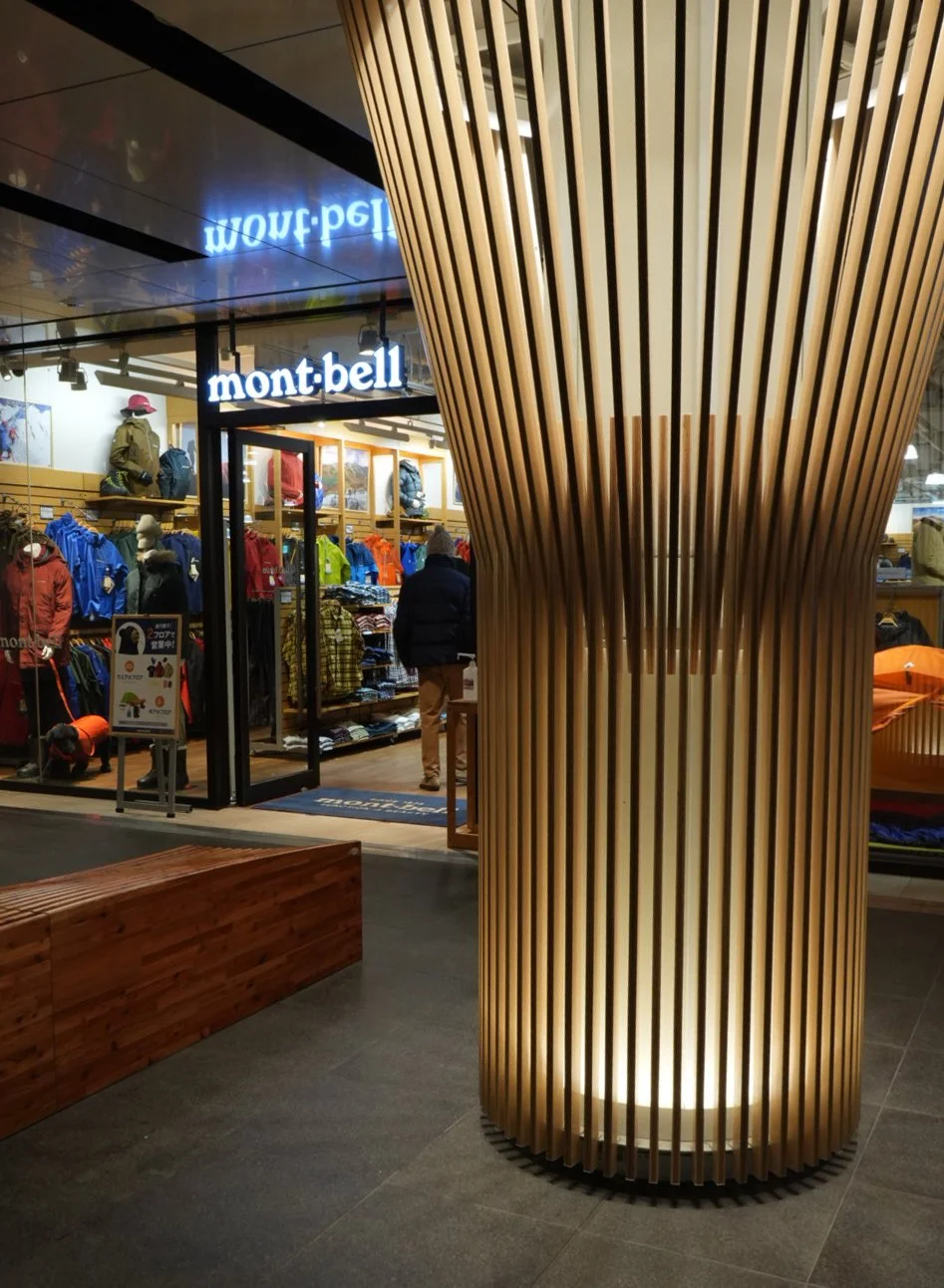 See this picture for MontBell store for example, This company sell outdoor sports and camping products. The design of the bench and column covers do not only reflect on the company's brand, but also add texture and warmth to the utilitarian concrete tunnels.