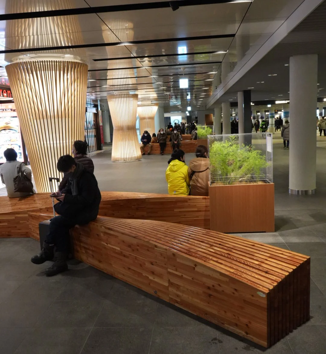 This photo shows built-in benches on the wall, near subway entrances. These benches, though will not win any design award, are very much appreciated. In a commuter society like japan, there will be waiting, and the need to sit and wait, or quickly take a break. These bench bars are simple and do not take much needed walking space for commuter. Simple and yet very effective!